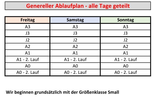 Bitte beachtet die ausgehängte Helfereinteilung in der Halle. Die Startlisten werden ebenfalls ausgehängt.